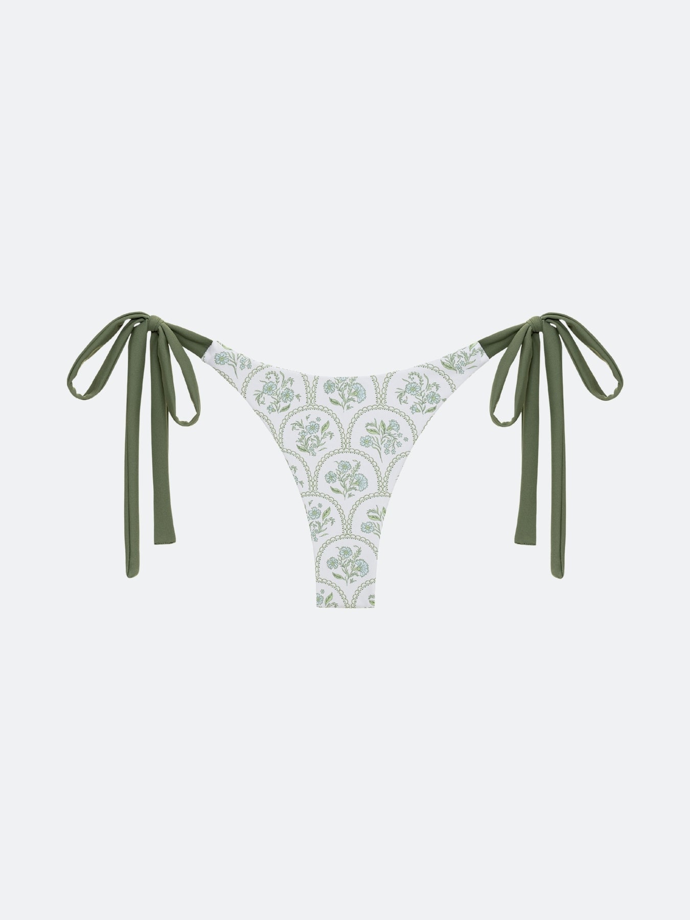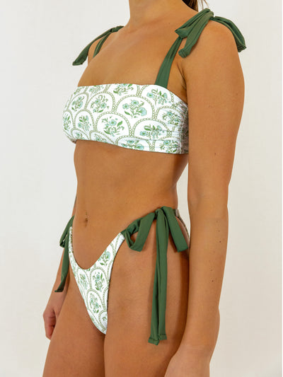 The Madaket Bikini Bottoms are fully reversible with a custom floral tile print on each side. Ties at each hip provide support and a stylish look. These bottoms can be pulled up to create a high leg and offer moderate coverage.