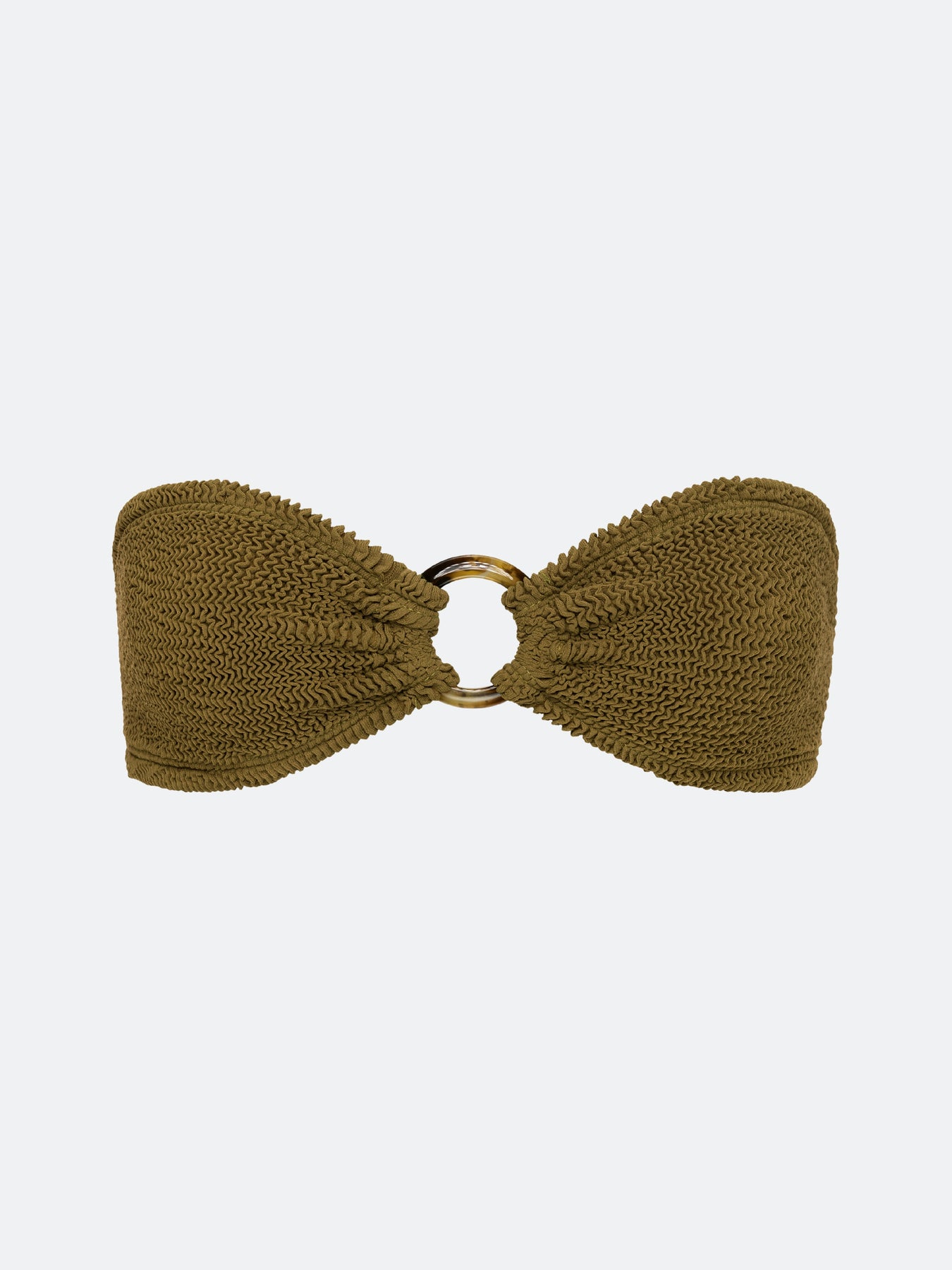 This strapless bandeau top ensures a tan line-free sunbathing session and is made in our custom crinkle fabric with a tortoise shell o-ring. This top will effortlessly stretch to fit U.S. cup sizes A-DD.