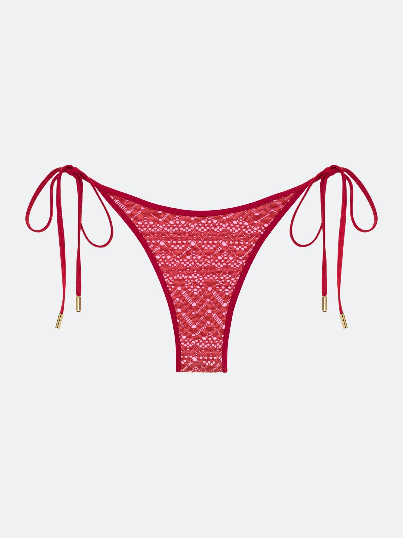 This red mesh side-tie bottom is so good—pink lining peeks through for the cutest two-tone vibe. Tie it high on your hips, get that leggy look, and enjoy just the right amount of cheek.