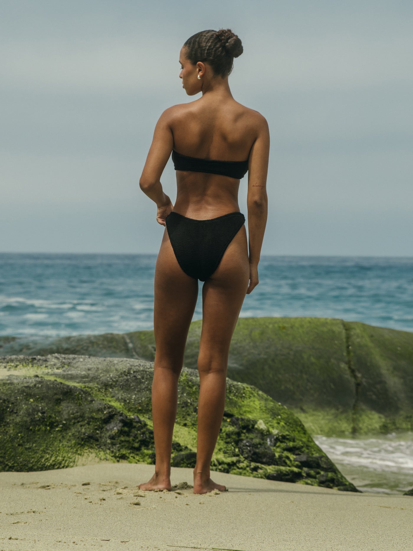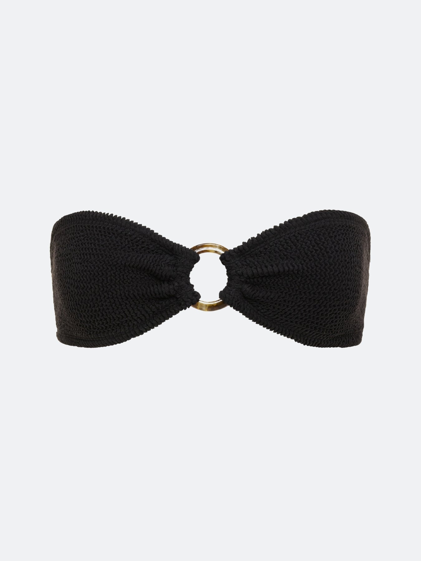 This strapless bandeau top ensures a tan line-free sunbathing session and is made in our custom crinkle fabric with a tortoise shell o-ring. This top will effortlessly stretch to fit U.S. cup sizes A-DD.