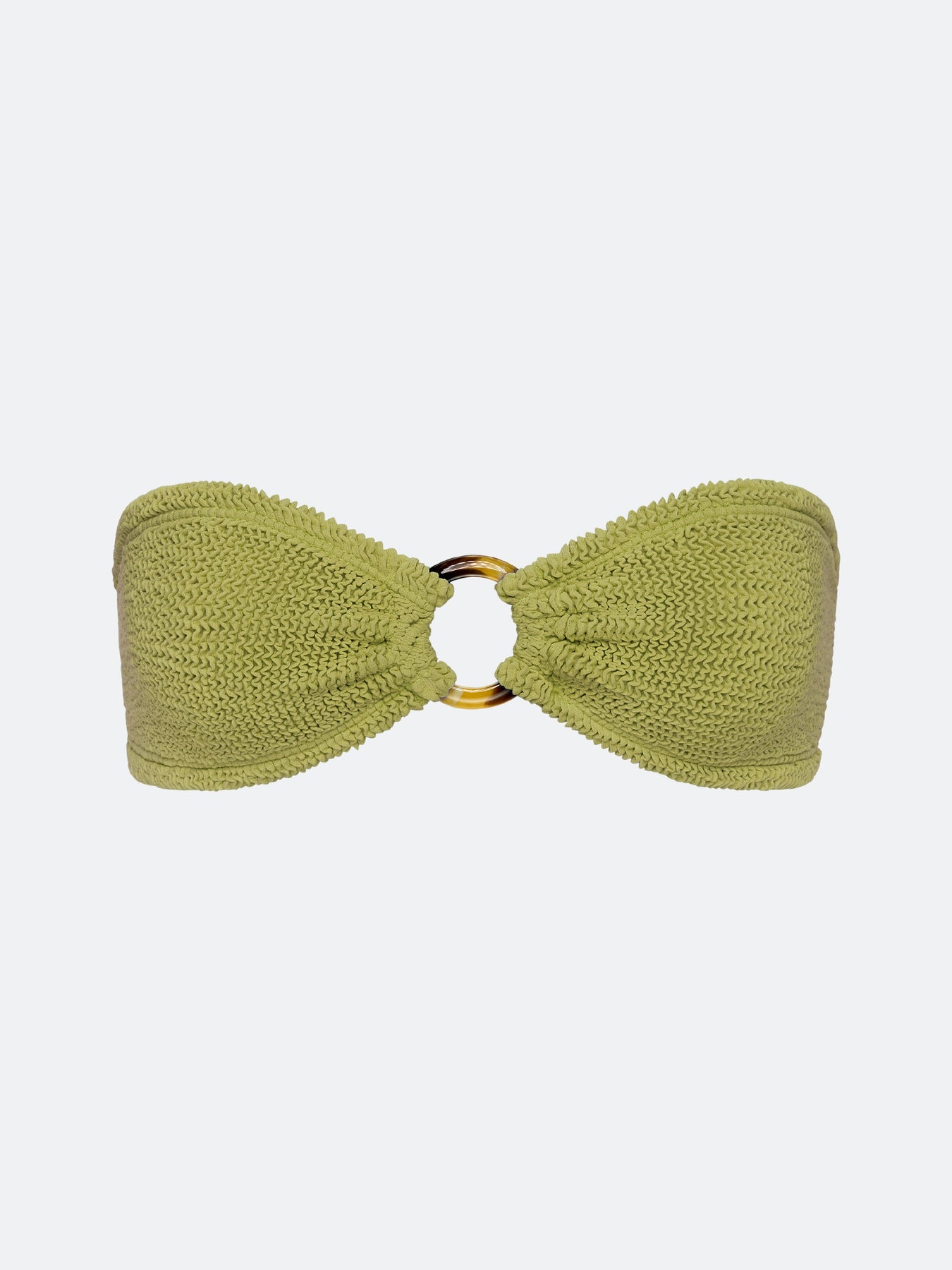 This strapless bandeau top ensures a tan line-free sunbathing session and is made in our custom crinkle fabric with a tortoise shell o-ring. This top will effortlessly stretch to fit U.S. cup sizes A-DD.